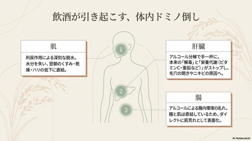 加えてアルコールは腸内環境にも影響を与えます。腸の状態が乱れると肌トラブルに出やすいというのは、肌と腸がつながっているから。「飲み会続きだと肌荒れする」は、まさにこのしくみで起きていることです。