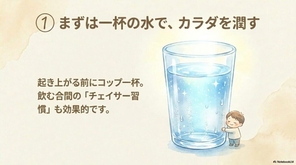 最もシンプルで、最も効果的なのが「水を飲むこと」。アルコールの利尿作用で体は思っている以上に脱水状態になっています。起き上がる前にまずコップ一杯の水を飲むだけで、体の巡りがずいぶん変わります💧