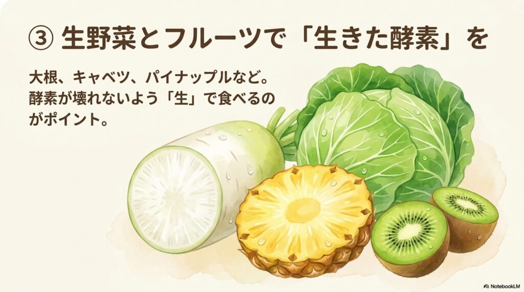 大根・キャベツ・山芋・パイナップル・キウイなどは酵素を多く含む食材です。ただし加熱すると酵素が壊れやすいので、できるだけ生のまま食べるのがポイント💡