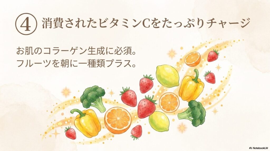 柑橘類・いちご・パプリカ・ブロッコリーなどに豊富に含まれています。フルーツを朝に一種類プラスするだけで、ずいぶん気持ちが違いますよ。