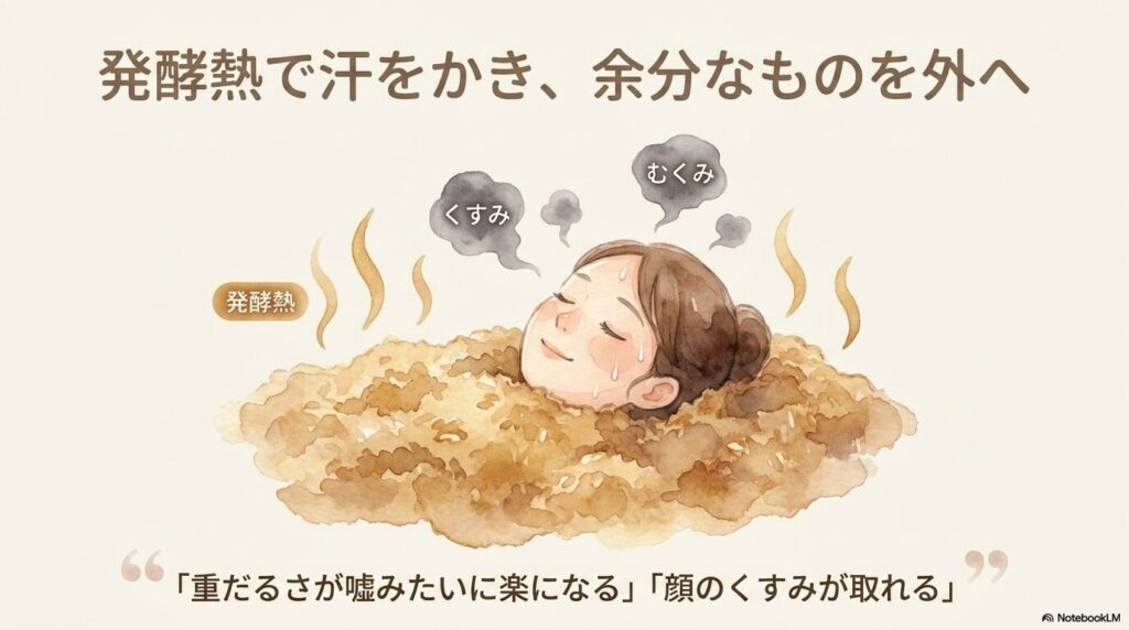 米ぬかの発酵熱でじんわり体の芯まで温まることで、血流と代謝が一気に活性化します。汗をかくことで余分なものを外に出しやすくなり、お肌のくすみやむくみが取れる感覚を実感される方も多いです🥹