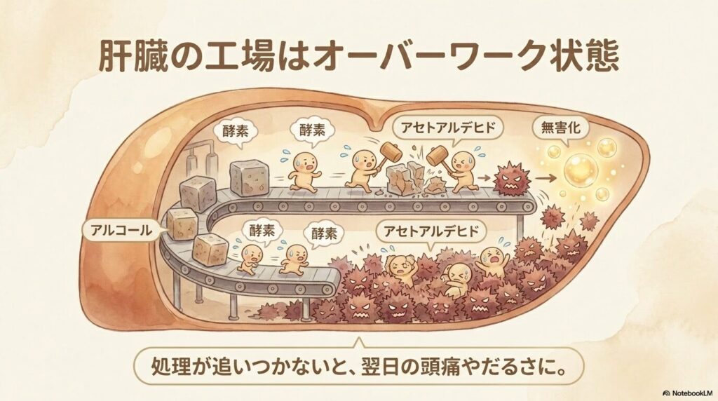 まずアルコールを「アセトアルデヒド」という物質に変え、それをさらに分解して無害化する、という2段階の作業をしてくれているんです。飲みすぎた翌日に頭痛やだるさが残るのは、この処理が追いつかずアセトアルデヒドが体に残ってしまうから。