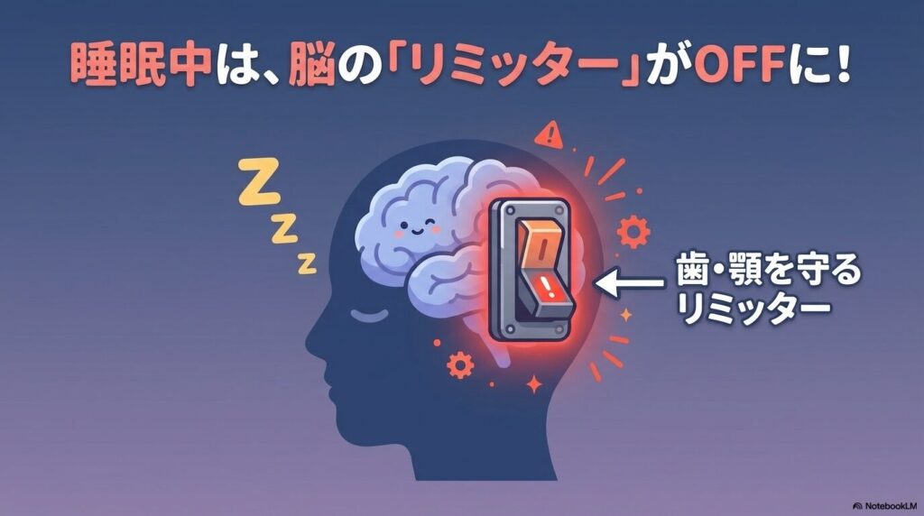 - 眠っている間は脳のリミッターが外れるため、体重の数倍もの力が歯や顎にかかることも