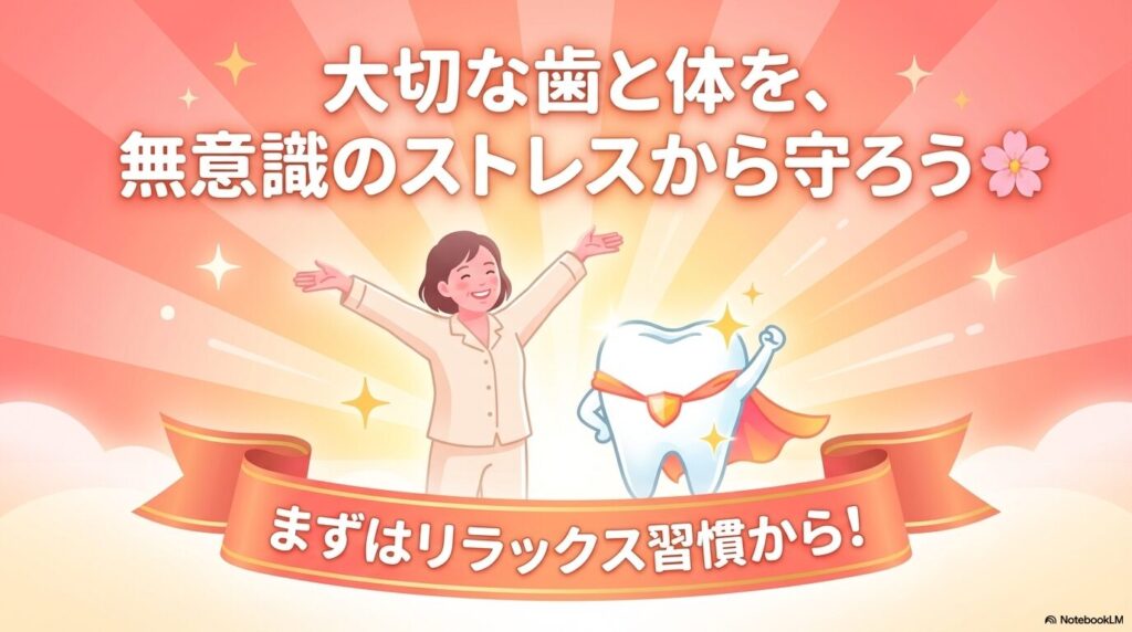 - 朝の顎の疲れや原因不明の肩こりに気づいたら、まずは歯科への相談と、寝る前のリラックス習慣を試してみてね✨