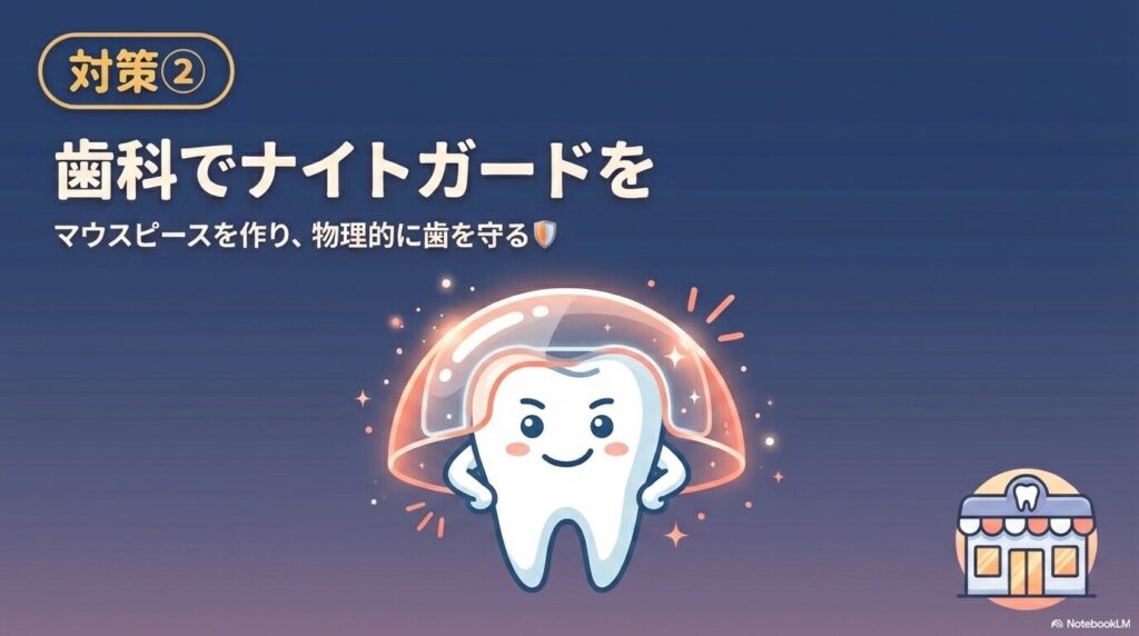 - 🦷 歯科で「ナイトガード(夜用マウスピース)」を作ってもらう。物理的に歯を守る、最も確実な方法です(私も歯科で作っていただきました☺️✨)