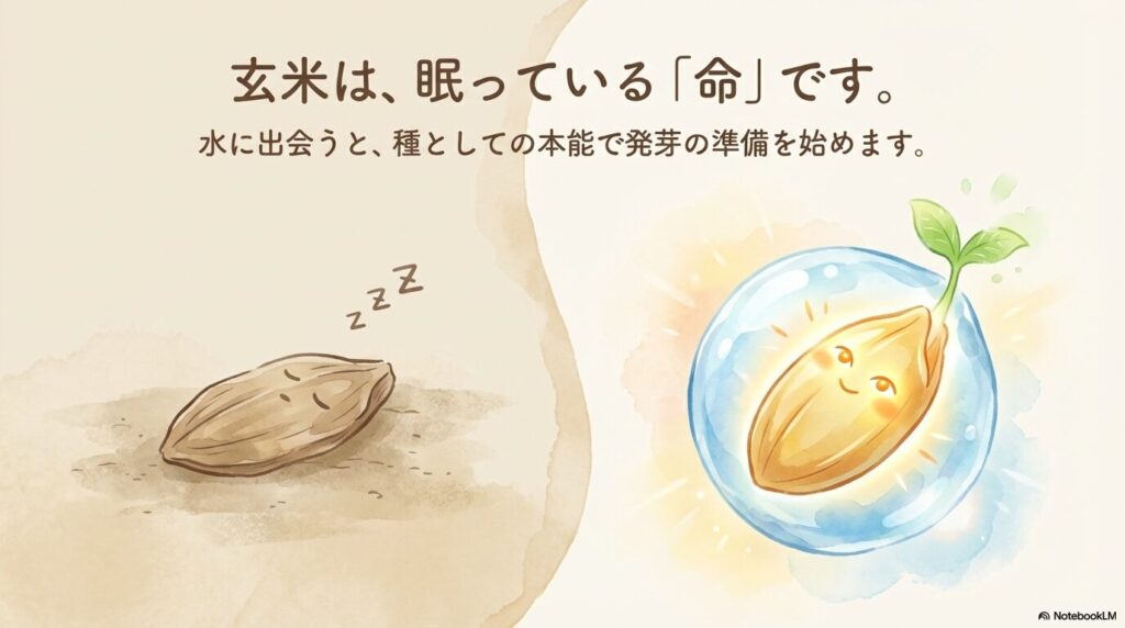 「えっ、水に浸すだけで?」と思いましたよね😳 実はこれ、玄米が「発芽しようとする力」を利用した仕組みなんです。
