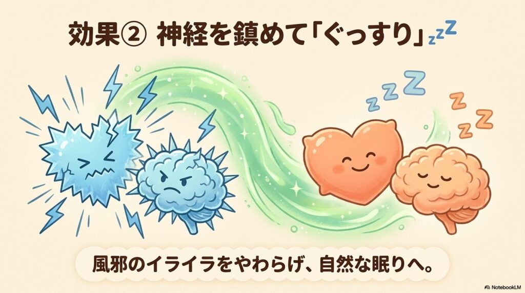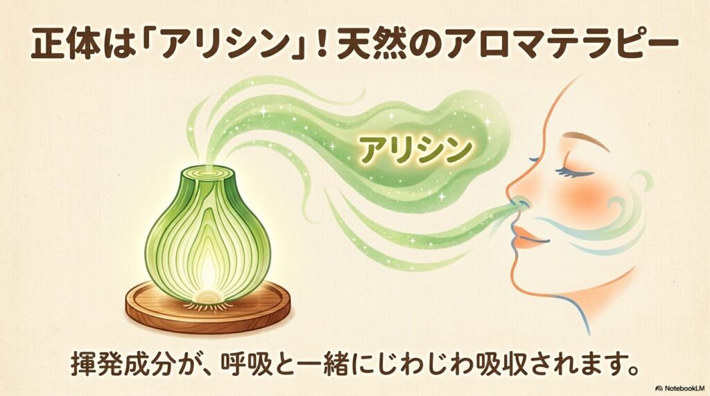 さらにアリシンの香り成分には、神経の高ぶりを鎮める「鎮静作用」もあることがわかっています。風邪でしんどい時って、体もしんどいけど気持ちもざわざわしませんか?そのイライラや寝苦しさをやわらげて、自然な眠りに誘ってくれるんです🥹
