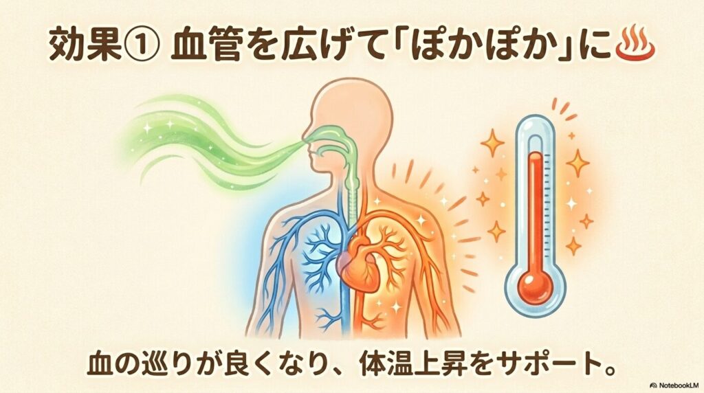 アリシンの香りを吸い込むことで期待できるのが、血流を促すこと。血管が広がって血の巡りが良くなり、体がじんわりポカポカ温まってきます♨️