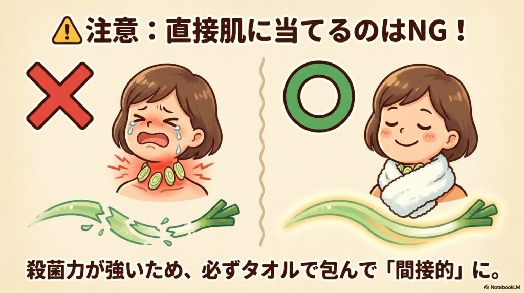 アリシンは殺菌力が強い成分でもあるため、ネギの断面を素肌に直接当てないこと。肌がかぶれてしまうことがあります。タオルや手ぬぐいでしっかり包んで、間接的に香りを届けるのが正解です。