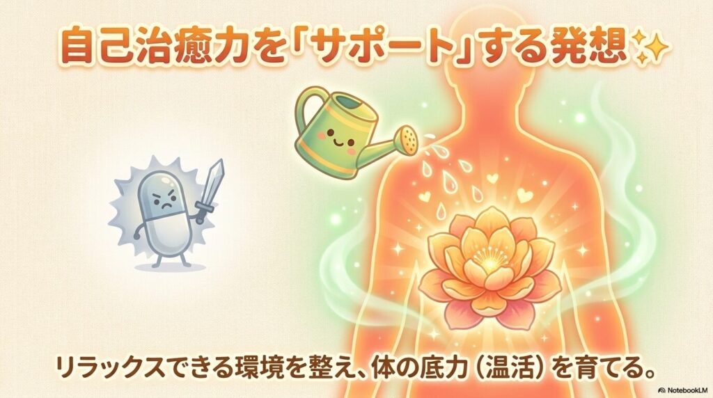 体を芯から温めて血の巡りをよくする。リラックスできる環境を整えて、自然な回復力を引き出す。特別な薬ではなく、体が本来持っている力をサポートしていく、という発想です。