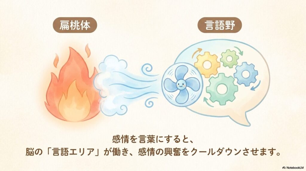 ところが、感情を言葉にした瞬間に、脳の中で「言語を使う部分」が働き始めます。するとその働きが扁桃体の活動をやわらげてくれることが、脳科学の研究でも報告されています。