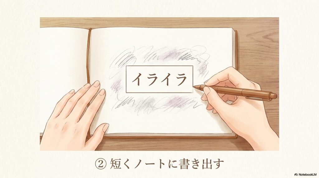 - ノートやメモに書き出す:「今日〇時頃、△△でイライラした。これは怒りだと思う」のように短く書くだけ