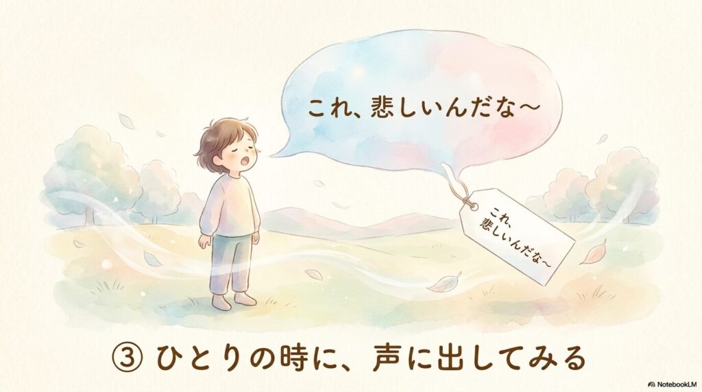 - 声に出してみる:ひとりの時に「あ〜、これ悲しいんだな〜」と声に出すと、さらにスッキリしやすいという方もいます